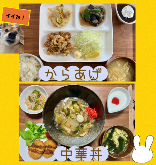 ☟ジューシーな唐揚げと、野菜たっぷりの中華丼🍗