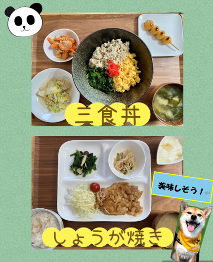 ☟彩り鮮やかな3色丼と、香ばしく焼き上げた生姜焼き😆